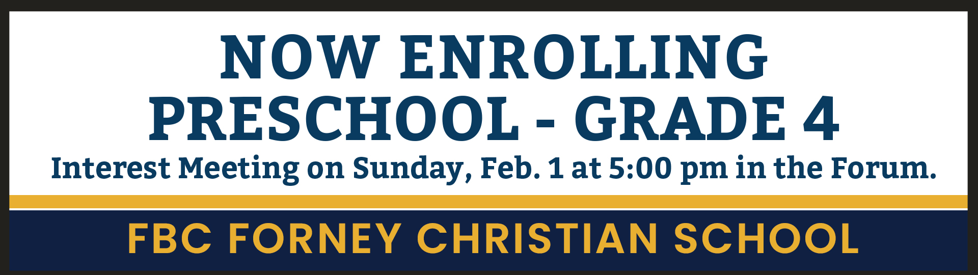 Midweek Discipleship Classes Wed, Jan 14, 6:30PM Contact: Aaron Scarbrough Email: ascarbrough@fbcforney.org