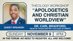 All adults ages 18+ are invited to our Nov. 9 Theology Workshop, "Apologetics and Christian Worldview" with keynote speaker, Dr. Carl Bradford. Dr. Bradford is the SWBTS Dean of Texas Baptist College, Associate Professor of Evangelism, and the Malcolm R. and Melba L. McDow Chair of Evangelism.