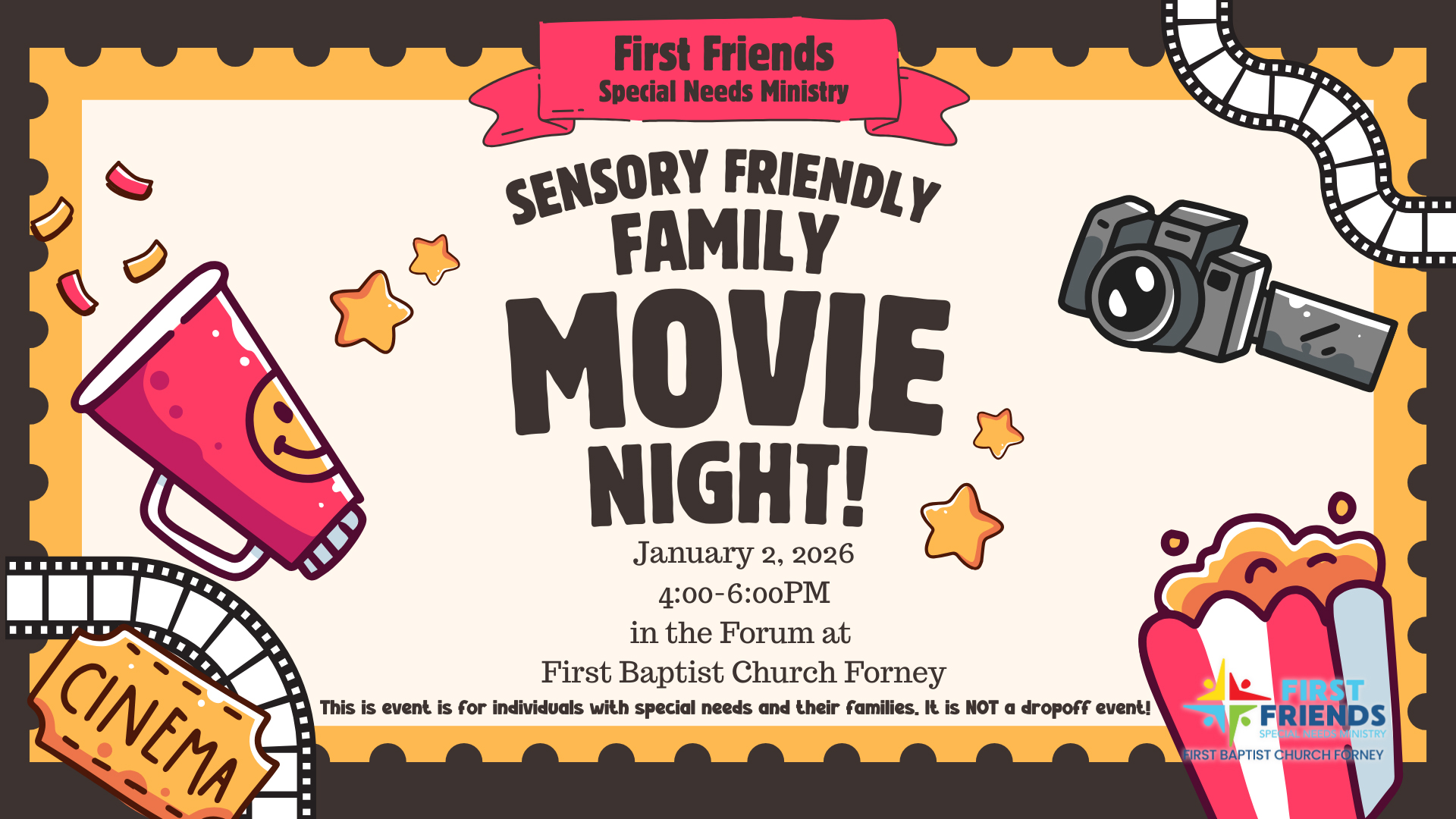 First Friends Special Needs Ministry invites you to join us for a sensory-friendly Family Movie Night for individuals with special needs. Bring your family, blankets, pillows, etc, and enjoy an evening of fellowship with other families with special needs. We will have popcorn and bottled water. This is not a drop-off event.