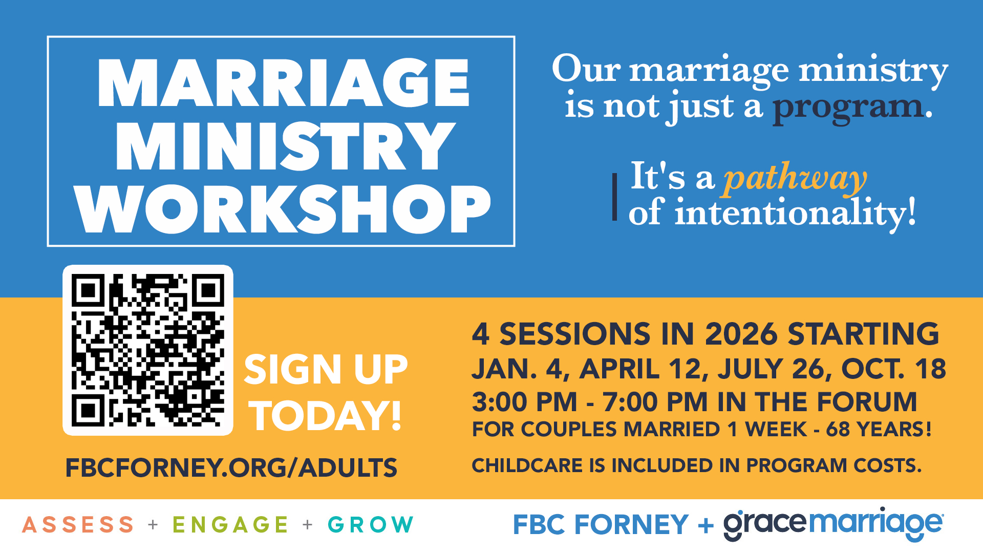 The 2026 Marriage Ministry Workshop will consist of four sessions led by Pastor Aaron Scarbrough, Pastor of Adults, and the Marriage Ministry team. It is for all couples, whether they have been married for one week or 68 years. If you participated in 2025 or would like to join us for the first time, we hope to see you there! We will be teaching all new lessons in Journal 2 this coming year.