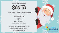 Families with children with special needs and their siblings are invited to meet our Sensory Friendly Santa on Sunday, December 7, from 4:00-6:00 p.m. in the CEC. Take pictures, enjoy cookies, make crafts, and more. This event is for individuals with special needs of all ages and their families.
