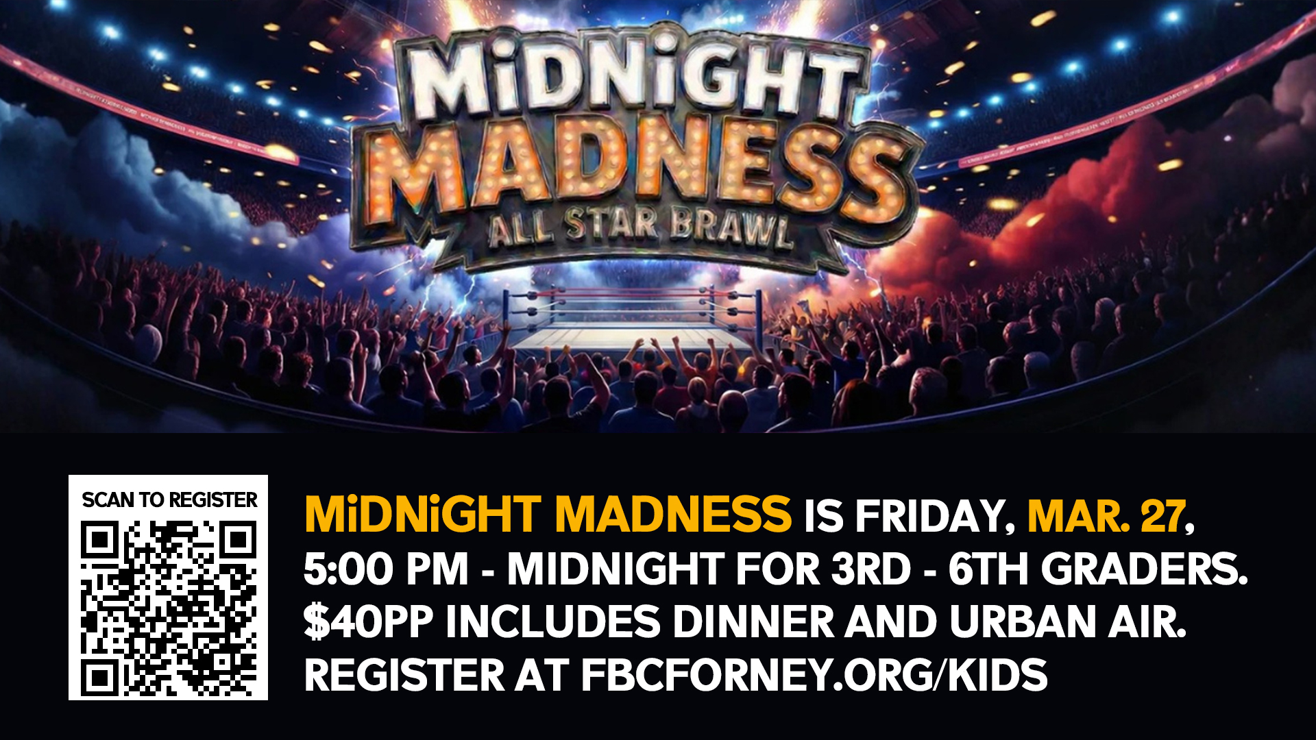 For kids in grades 3-6. Doors open at 4:30 pm to register. The event will be from 5:00 pm to midnight. Drop-off will be at the Mall, and pickup will be at the Forum. Cost is $40 per child - This includes dinner and 2 hours at Urban Air Adventure in Rockwall.
