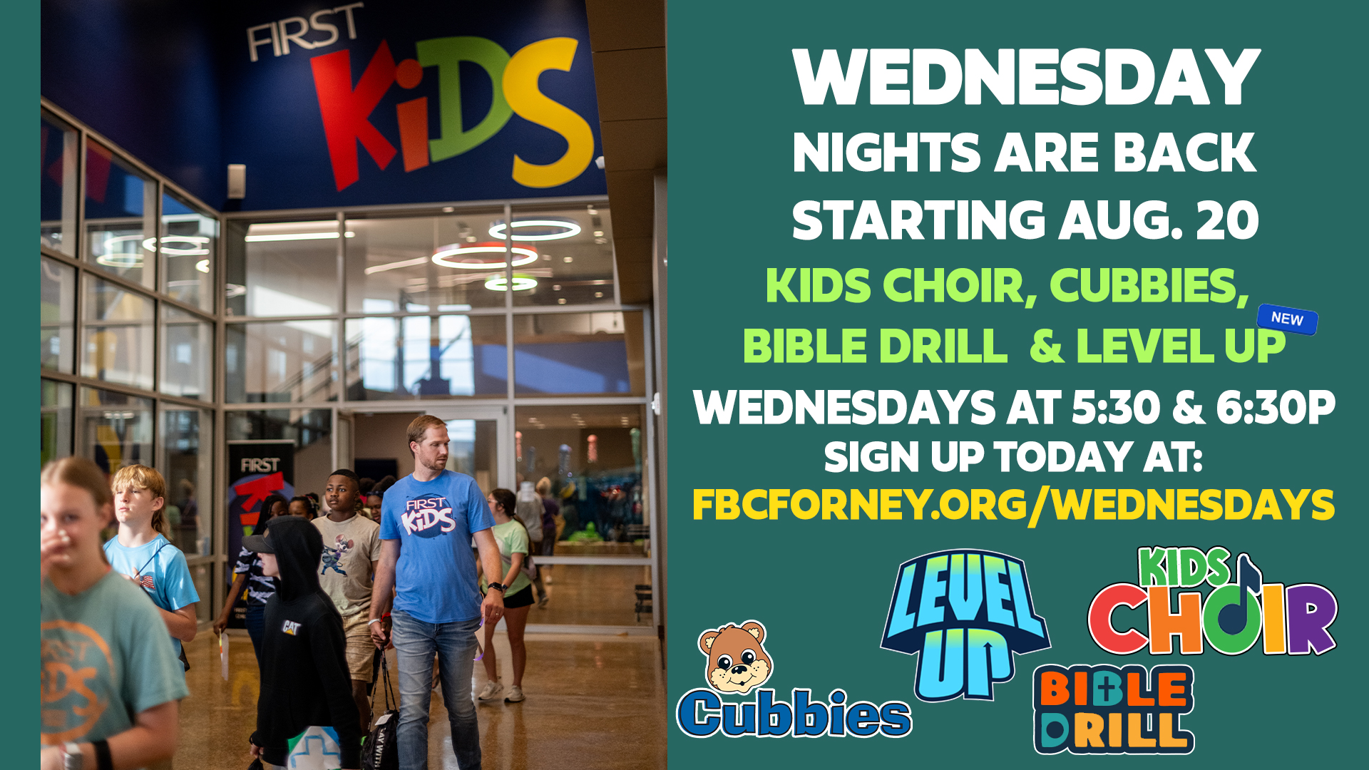 6:30 p.m.: LevelUp (Grades K-6), and Bible Drill